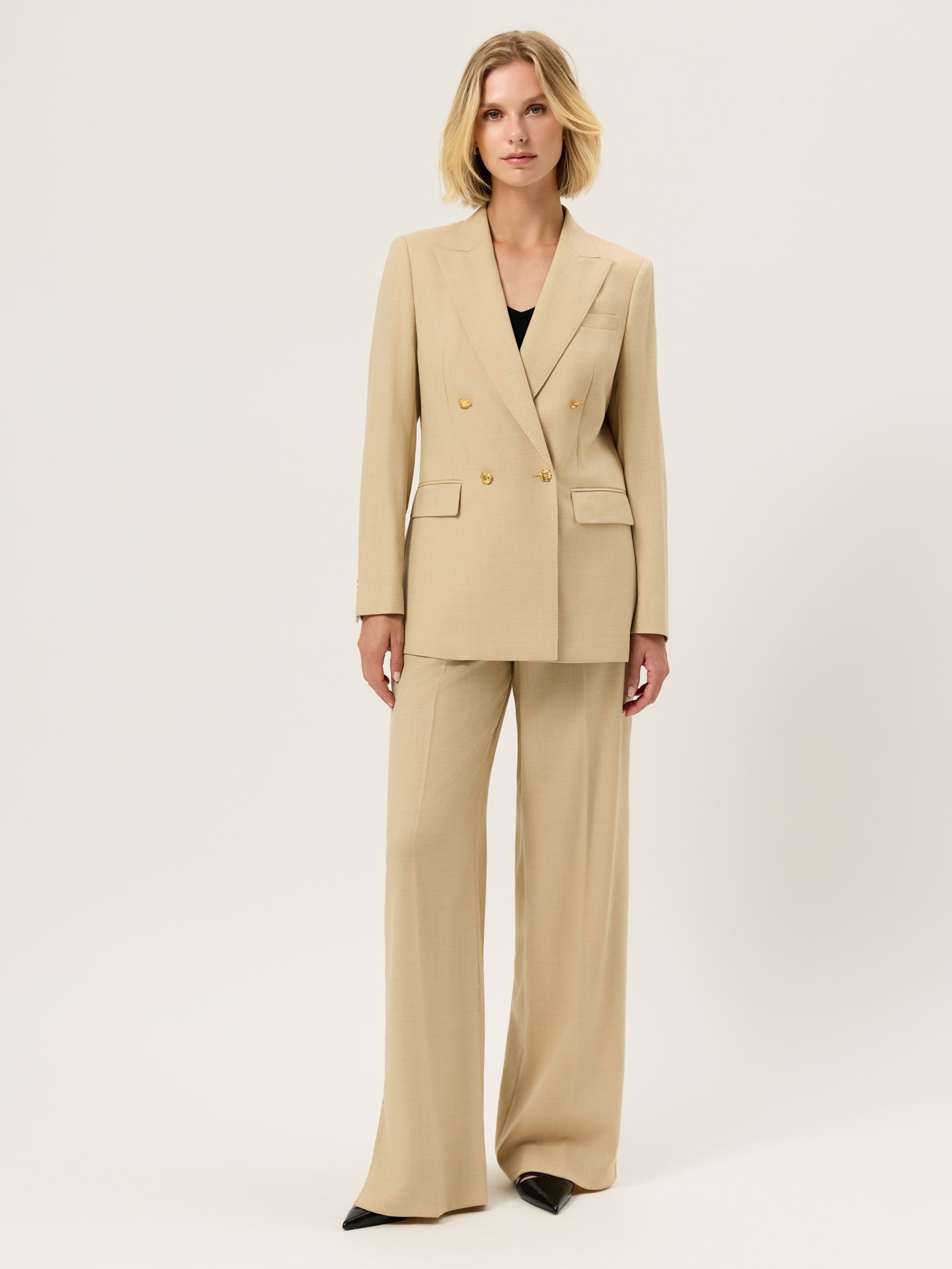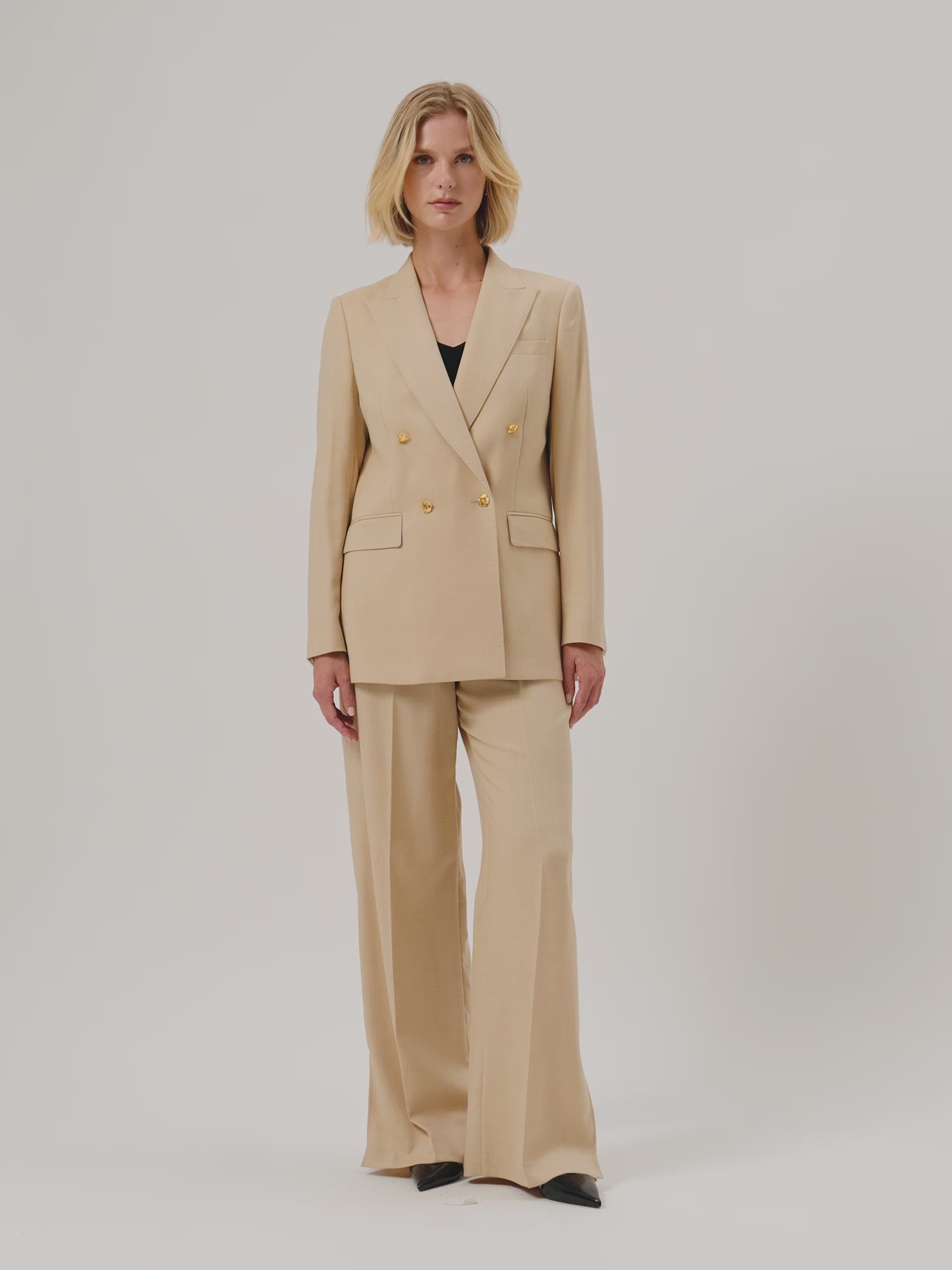 Double-breasted blazer with peak lapel with AMF, long sleeves with two button cuffs and two back slits. Expertly tailored from a Wool blend Herringbone fabric. Designed with a regular fit, fully lined interior and two front flap pockets. Special Details such as organic gold buttons.