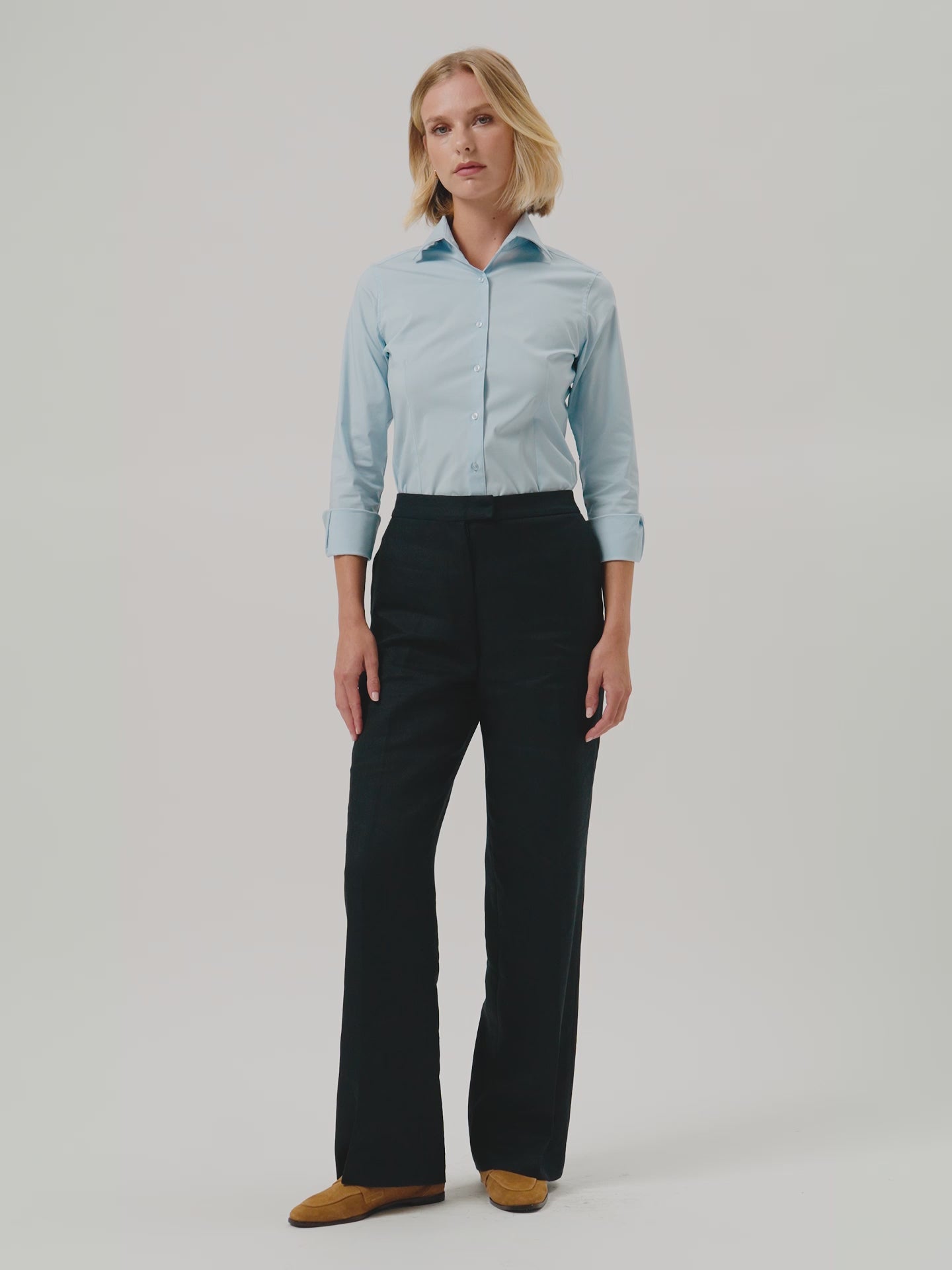 Travel line shirt made of high-quality plain comfort cotton poplin. Fabric made of blended cotton with added polyester and spandex fibres meaning every shirt can offer perfect comfort and an excellent fit, the top-performance yarns guarantee excellent elasticity, breathability, and shine. This slim fit shirt features an open collar and front button-up fastening with personalized buttons, two buttons at the collar stand, personalized collar stays, long sleeves and side gussets. Once you’ve tried it, you’ll never want to take it off.