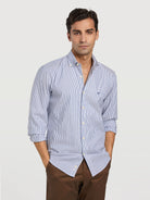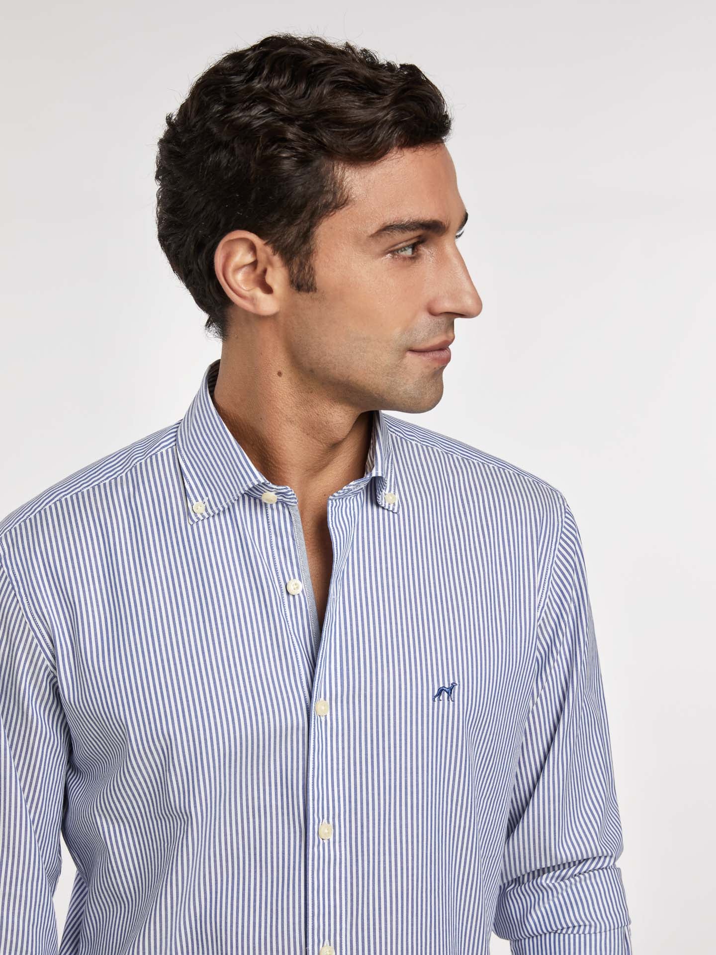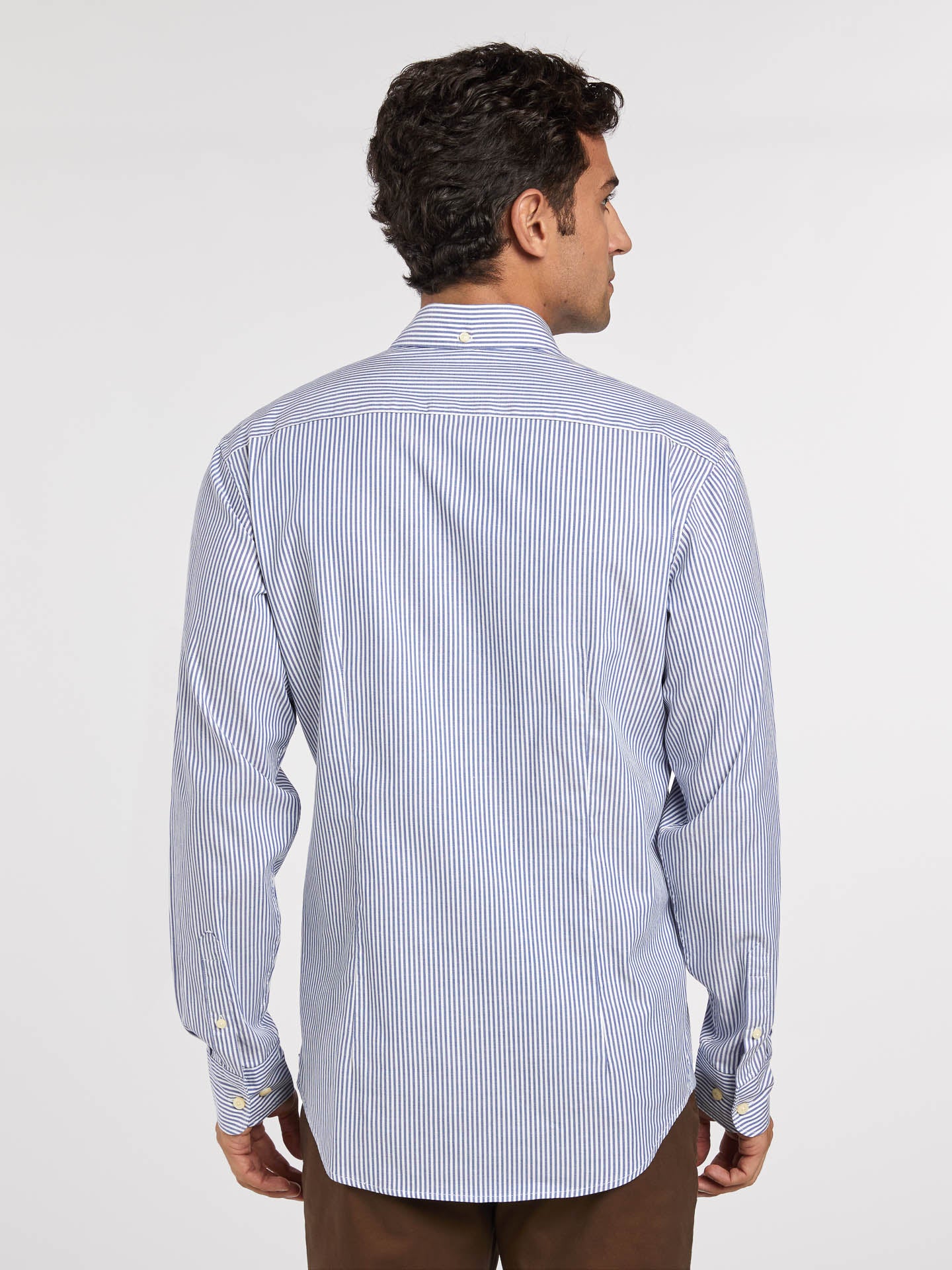 'Respekt' sport shirt made of 100% BCI cotton oxford stripes. Featuring slim fit, button-down collar and front button-up fastening. Long sleeves with single cuffs with 2 buttons. Chest logo embroidery. Shirt with some contrast details like inside yoke, inside front placket piping, side gussets and inside sleeve placket. 'Better Cotton Initiative' - this garment is made with the most ecological cotton: it's production sustains the health of soils, ecosystems and people by using natural processes rather than artificial inputs.