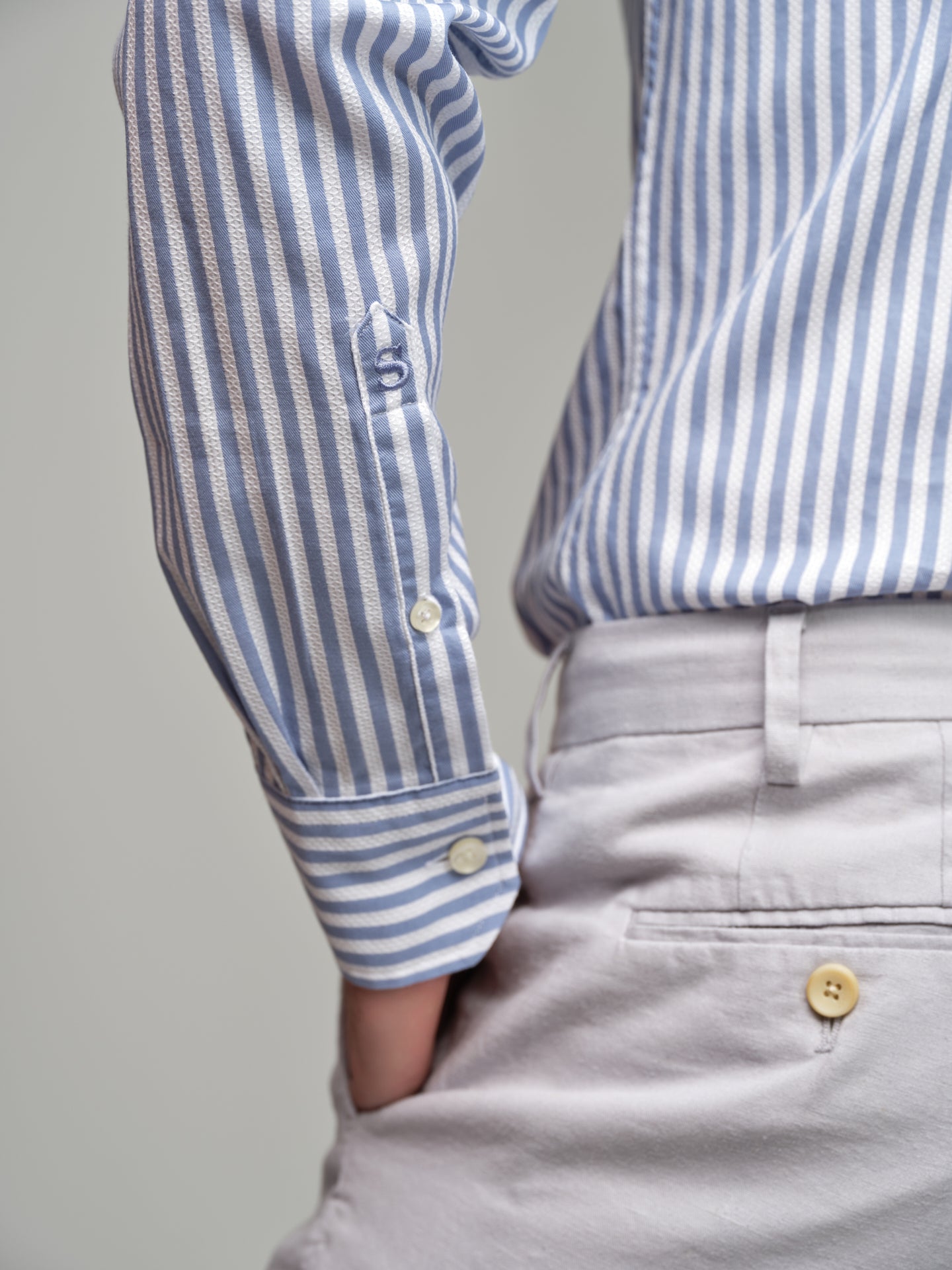 The men's suits from Sacoor Brothers are available with 'Drop 5' and 'Drop 6'. This designation refers to the difference between the blazer size and the trouser size. When ordering a size 46 with 'Drop 5', the trousers will be around size 41, while 'Drop 6' will result in trousers of size 40.