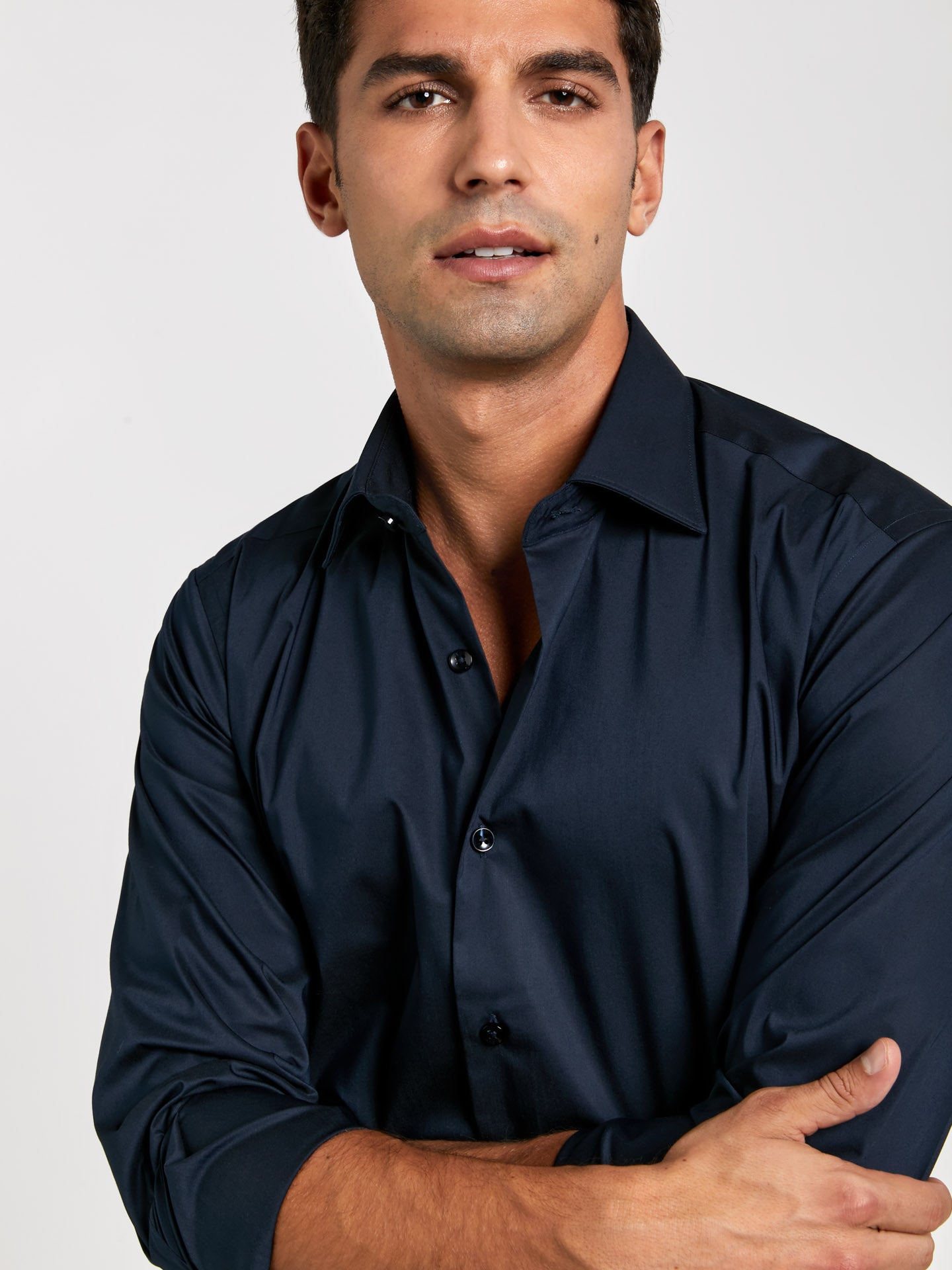 ICON K-Easy line shirt in plain comfort cotton poplin. Fabric made of blended cotton with added polyester and spandex fibres mean every shirt can offer perfect comfort and an excellent fit, the top-performance yarns guarantee excellent elasticity, breathability, and shine. Featuring slim fit, Oxford collar and front button-up fastening. Long sleeves with single cuffs with 2 buttons. Side gussets in self fabric. All shirts have regular fitting measures from size 44. This shirt is ideal for office wear and for those situations when looking impeccable is essential. Shirts for every occasion. Once you’ve tried them, you’ll never want to take them off.