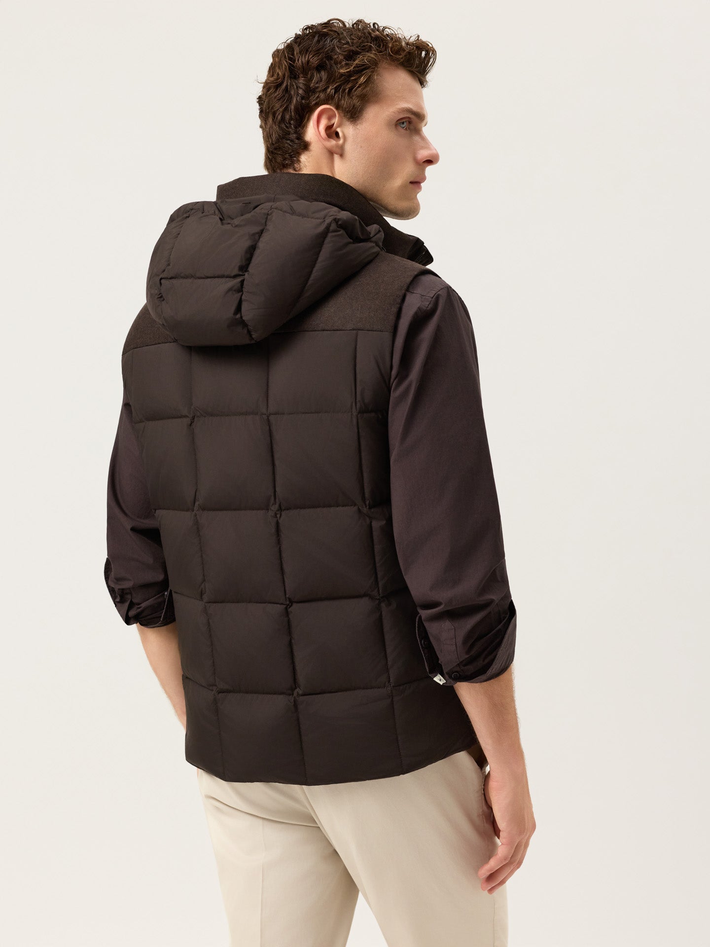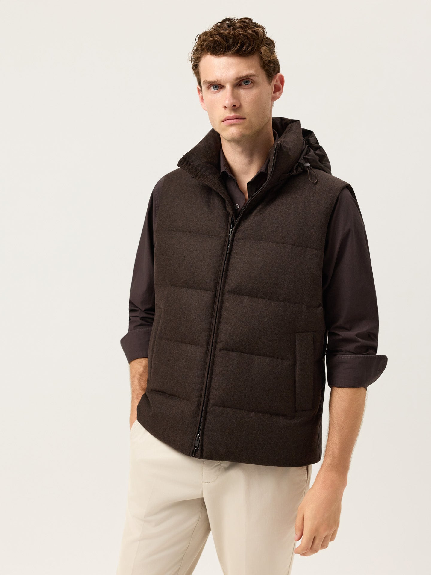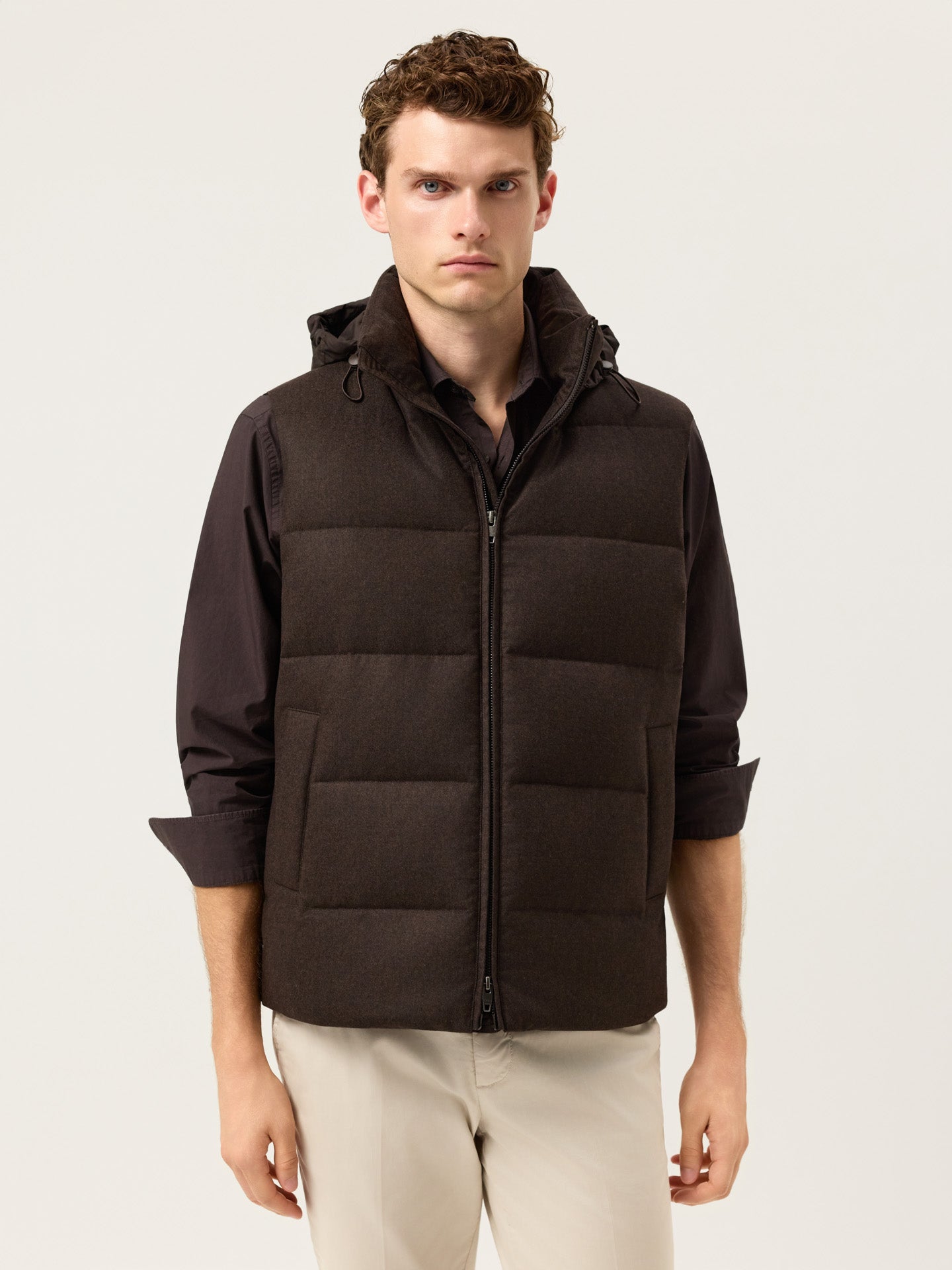 Sophisticated and warm, this waistcoat combines the luxurious texture of wool melange flannel at the front with a smooth polyester back and hood in a perfectly matched tone. It is padded with real down for excellent insulation and features horizontal quilting for a clean, structured look. Designed with a detachable hood, side welt pockets, and a double metal zipper puller on the front. The interior is fully lined with tonal piping and practical inner pockets. Finished with a metallic logo plate at the back collar and premium hardware in gunmetal shine.