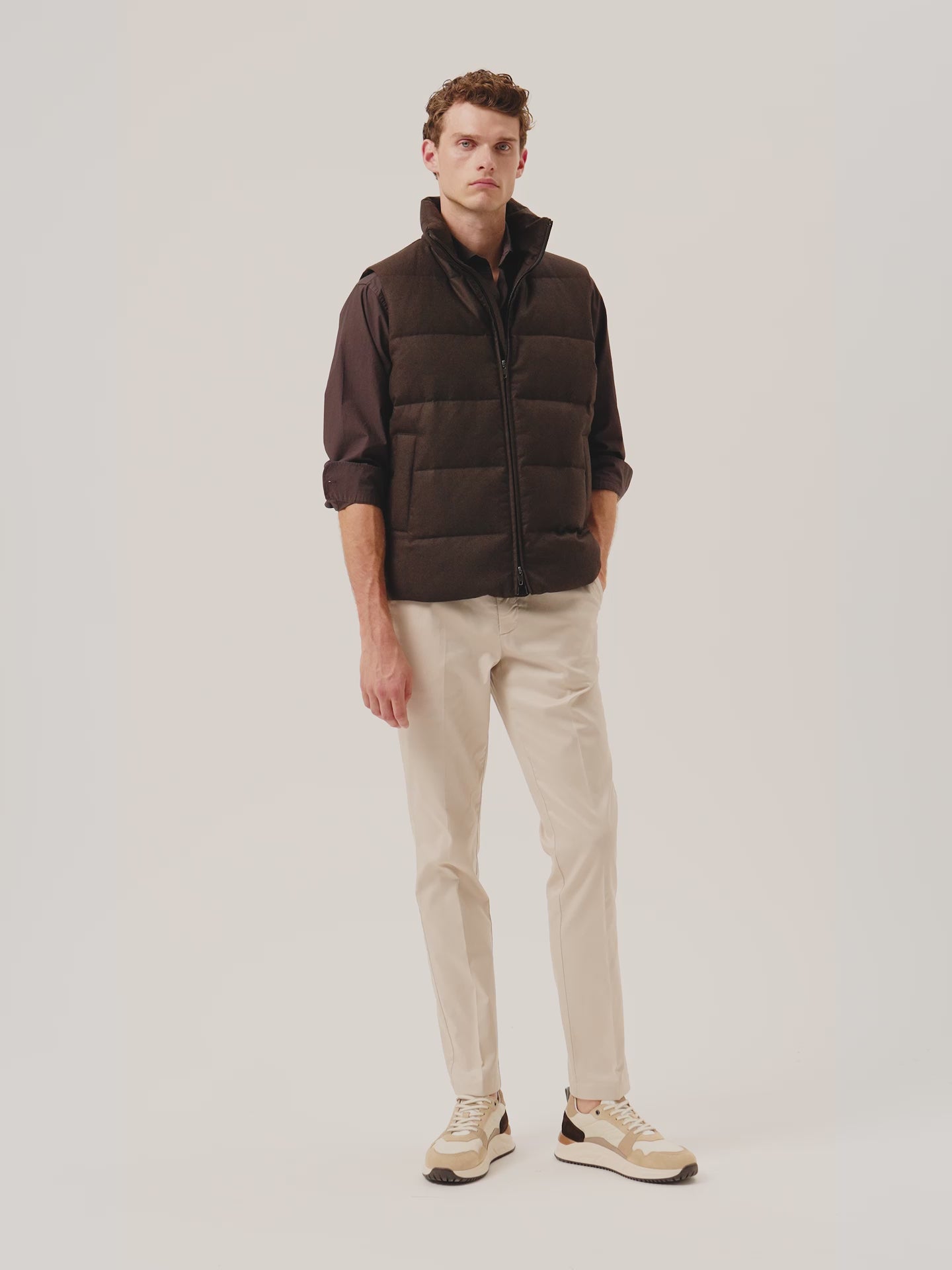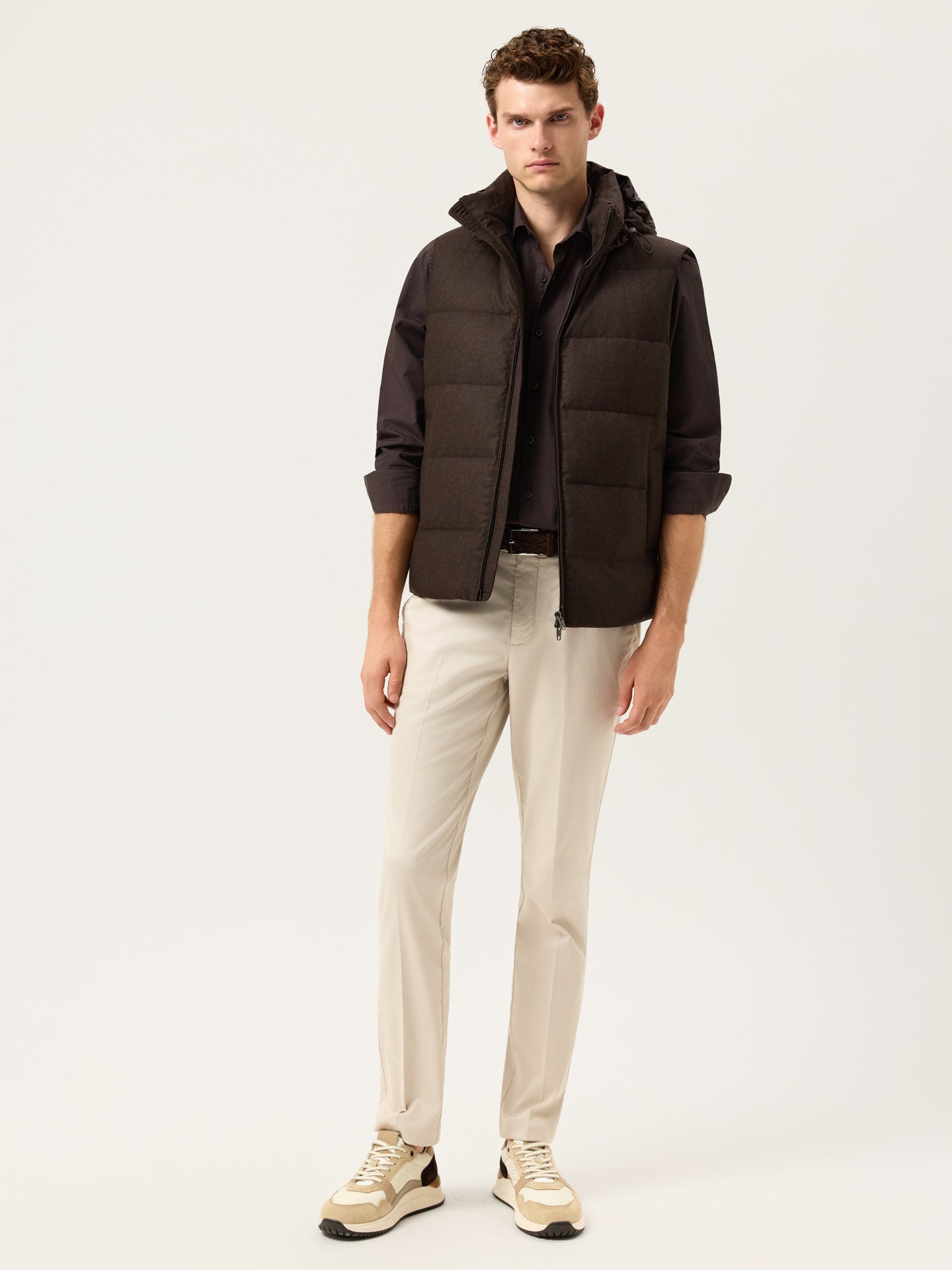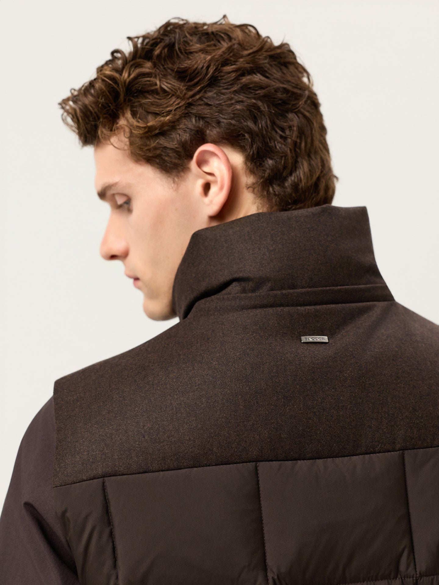 Sophisticated and warm, this waistcoat combines the luxurious texture of wool melange flannel at the front with a smooth polyester back and hood in a perfectly matched tone. It is padded with real down for excellent insulation and features horizontal quilting for a clean, structured look. Designed with a detachable hood, side welt pockets, and a double metal zipper puller on the front. The interior is fully lined with tonal piping and practical inner pockets. Finished with a metallic logo plate at the back collar and premium hardware in gunmetal shine.