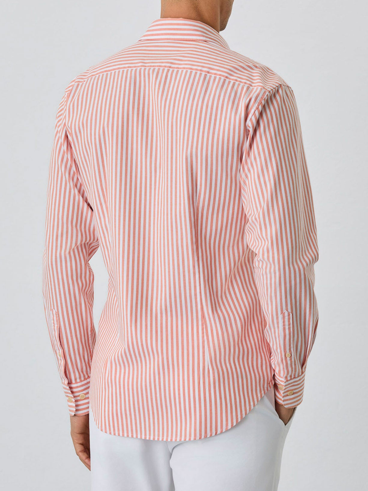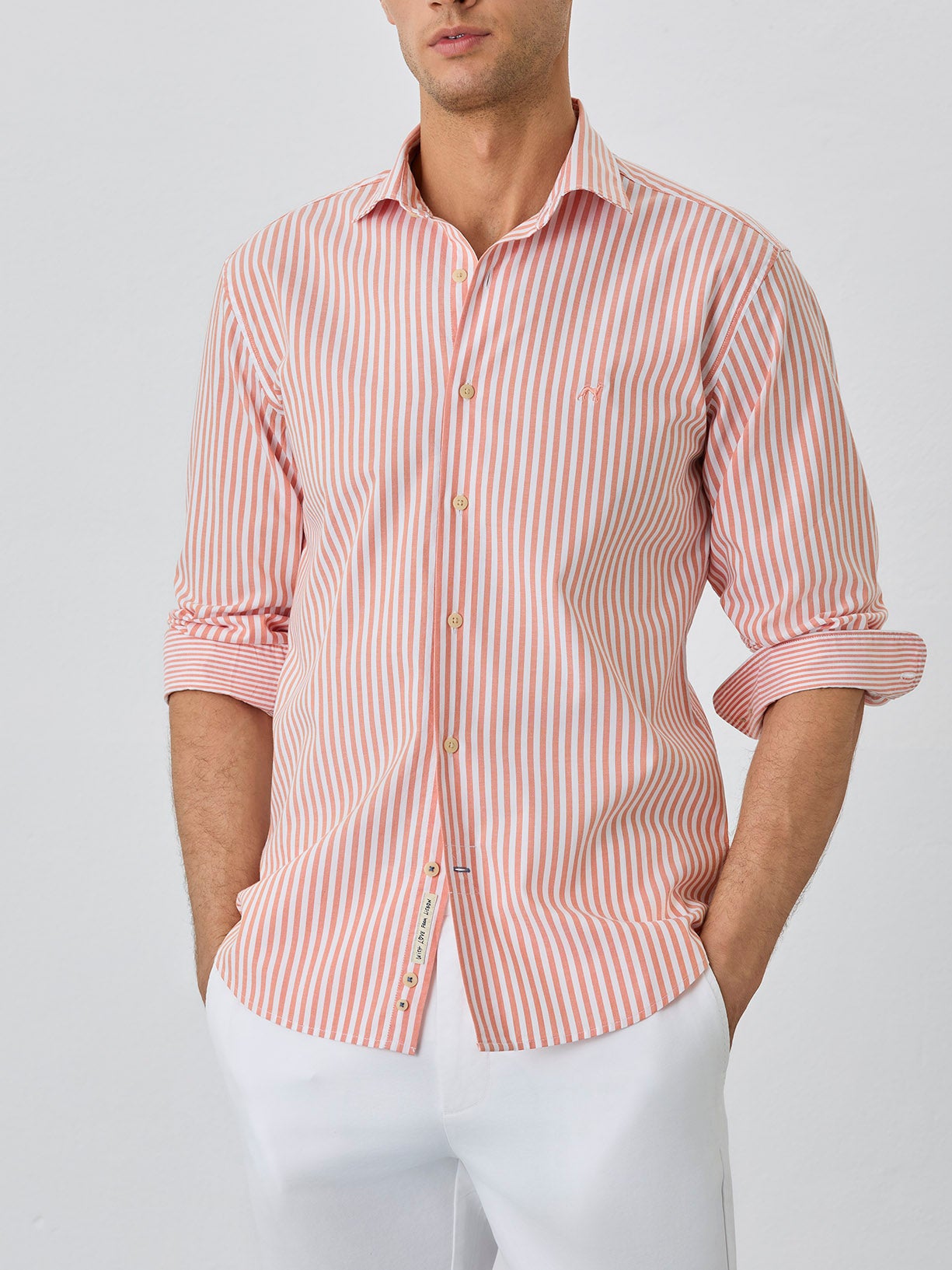 'Respekt' sport shirt made of 100% BCI cotton oxford stripes. Featuring slim fit, open spread collar and front button-up fastening. Long sleeves with single cuffs with 2 buttons. Chest logo embroidery and label 'with love from Lisbon' inside front placket. 'Better Cotton Initiative' - this garment is made with the most ecological cotton: it's production sustains the health of soils, ecosystems and people by using natural processes rather than artificial inputs.