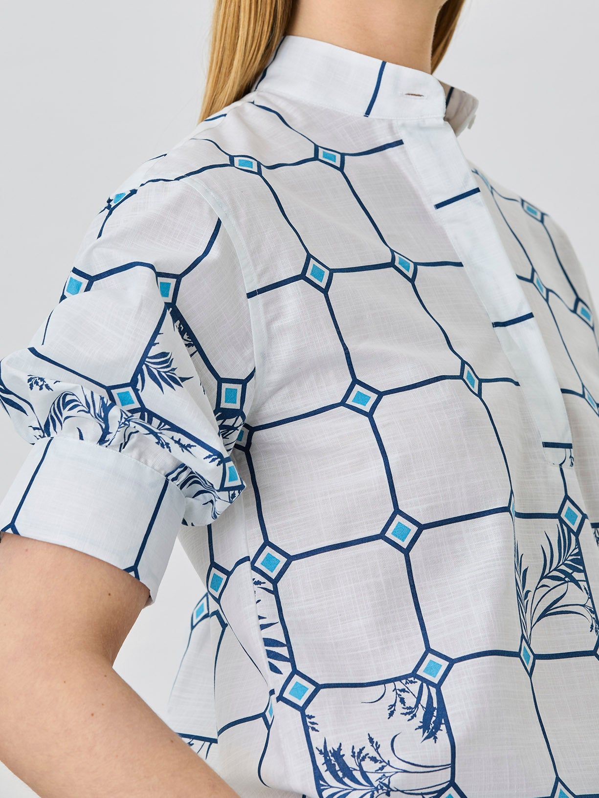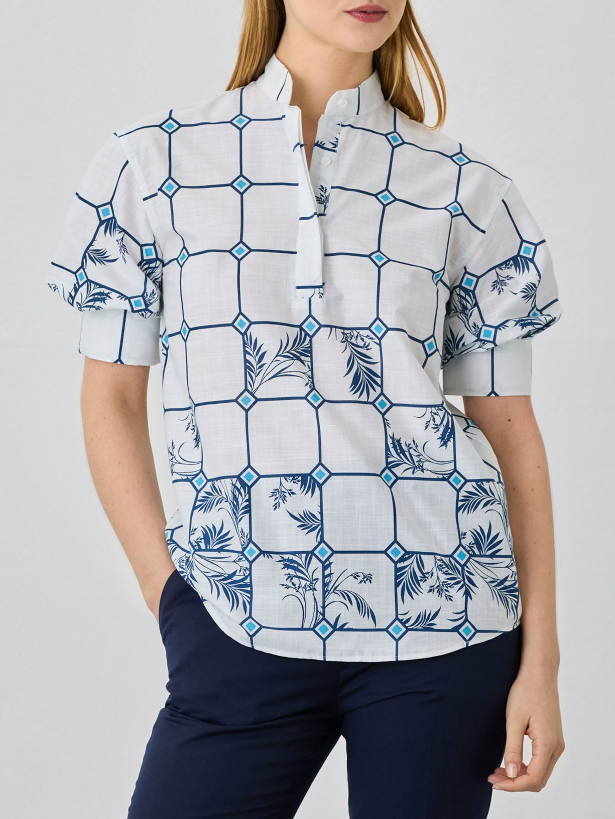 Balloon Sleeves Popover Shirt With Mao Collar In Cotton Jaquard Fabric